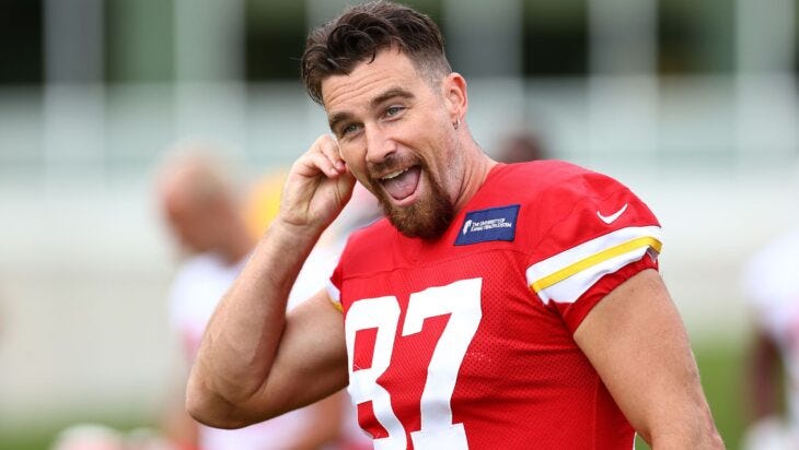 Taylor Swift has said goodbye tortured artist, hello chronic traumatic encephalopathy. Her new rumored beau, one Travis Kelce, is by all accounts a simple man: a goofball, a good guy, an all-American podcaster with a reality TV past, and most importantly, a departure from her usual brand of boy. Which makes sense. Taylor has reached a new echelon of fame and her requirements for a beau must be a little different.